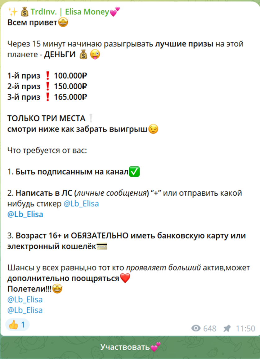 Группа TrdInv Elisa Money регулярно публикует одинаковую информацию. Там подписчиков призывают участвовать в розыгрышах. Причем нужно выполнить простые правила: подписаться на канал, отправить в личные сообщения текст, а затем перевести деньги на свою карту. Никакие дополнительные действия не указаны. Нет и других условий.