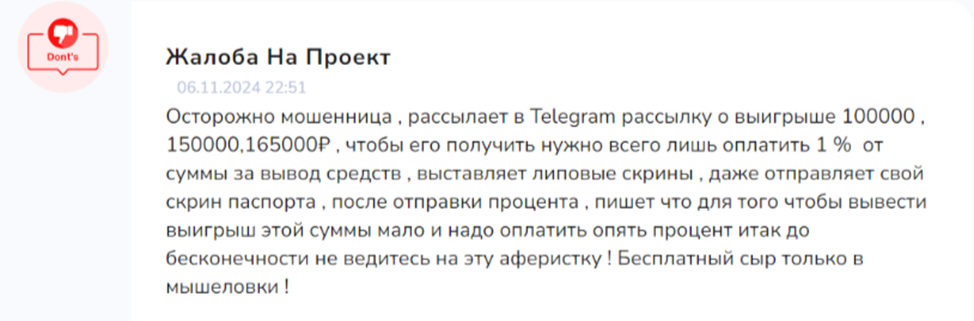 При проверке скам-проекта TrdInv Elisa Money мы нашли жалобы на автора сообщества. Указано, что аферистка применяет психологическое воздействие для личной выгоды, то есть для получения денег. Но подписчикам ничего не выплачивают.