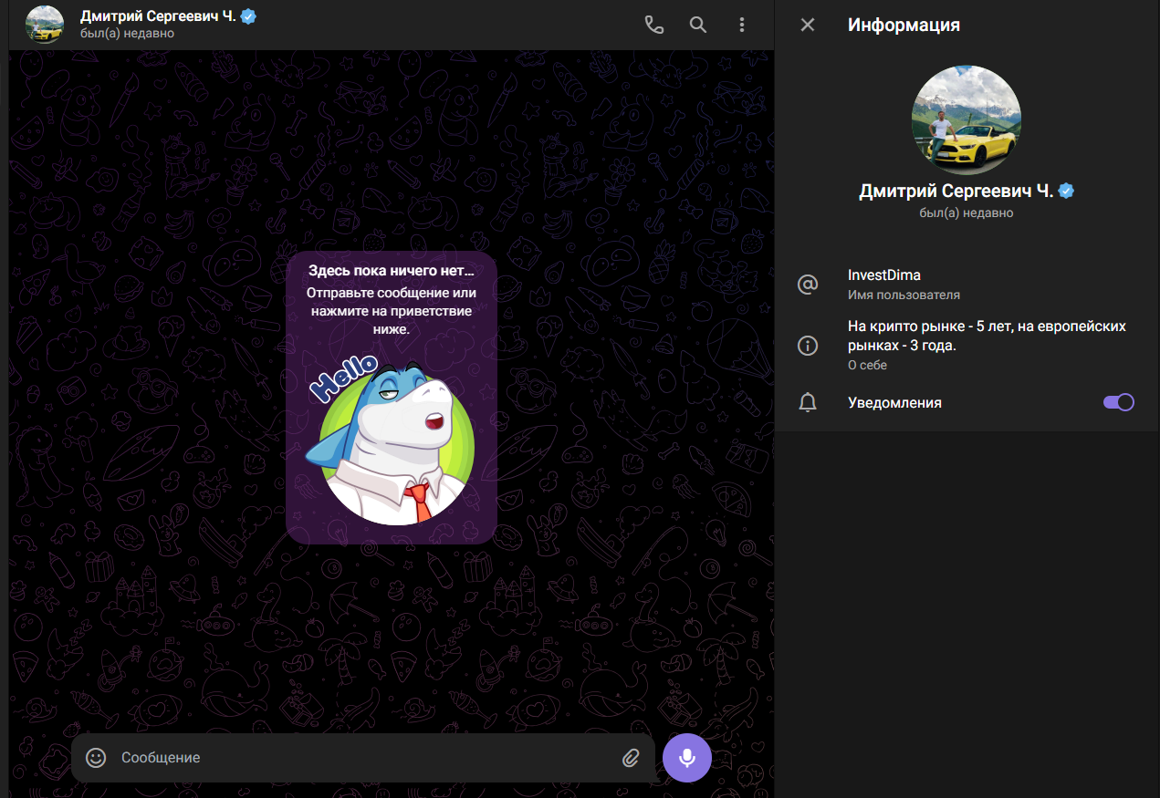 Трейдер Дмитрий Сергеевич позиционирует себя опытным и успешным. Он заявляет, что зарабатывает деньги на крипте на протяжении пяти лет, а три года назад вышел на европейский рынок и якобы увеличил свою прибыль в разы. На декабрь 2025 года инвестор зарегистрирован в Телеграмм и во ВКонтакте, но в открытом доступе о своих услугах не рассказывает. В обзоре, используя опыт настоящих клиентов, проанализируем, как предлагает зарабатывать трейдер, и каких финансовых результатов удалось достигнуть в сотрудничестве с ним.