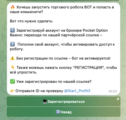 Доступ к сервису бесплатный. Чтобы им начать пользоваться, нужно зайти в бота shadowtrader77 bot и проследовать предлагаемым им инструкциям. Главное требование для работы с роботом — это регистрация по рефералке трейдера на бирже PocketOption.