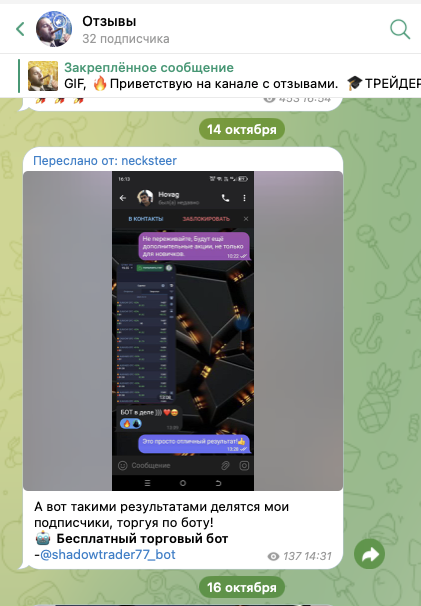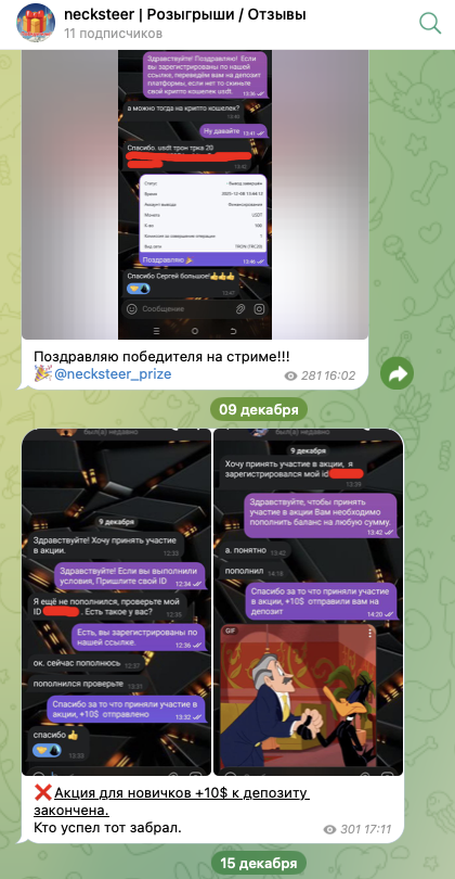 Другой тг-канал трейдера — это «Necksteer Розыгрыши Отзывы», который размещается по адресу necksteer prize. Он насчитывает всего 11 подписчиков. Публикации на нем — это информация об акциях по типу розыгрышей 10-20 долларов к депозиту его рефералов.