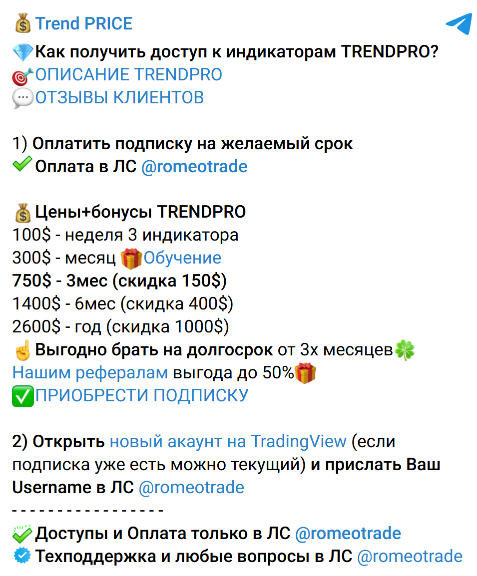 После оплаты необходимо открыть профиль на TradingView. Дальше требуется отправить свой ник автору проекта по ссылке Romeotrade. Для бронирования услуги также предлагается бот TrendPremiumBot.