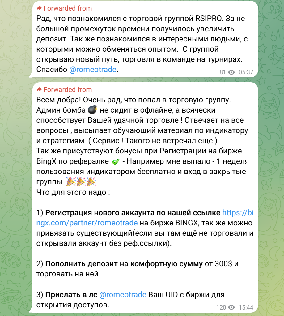 Чтобы доказать качество платформы, Роман создал собственное сообщество в ТГ под названием Отзывы группа RSIPRO. Здесь он добавляет сообщения клиентов, которые берутся из личной переписки. Понятное дело, что все пользователи оставляют только позитивные мнения.