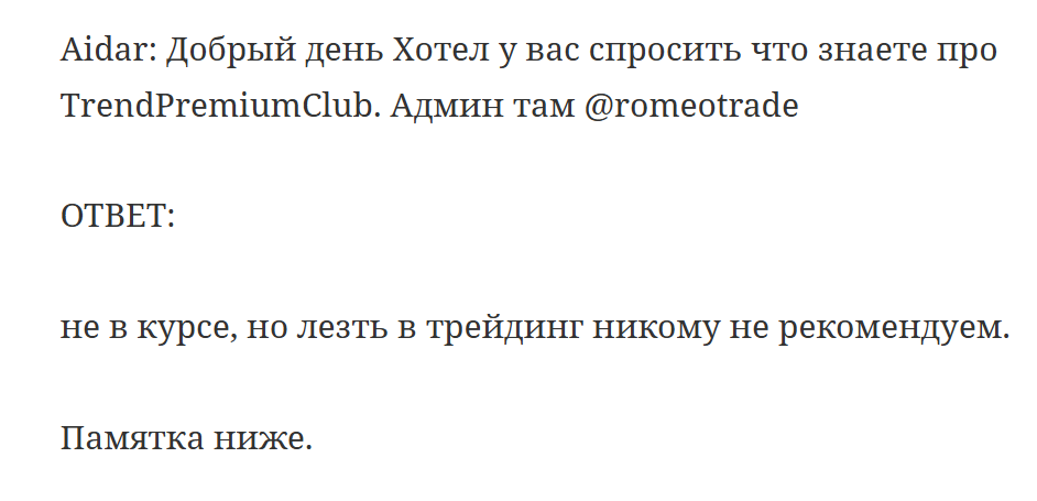 Несмотря на активную деятельность платформы, найти отзывы о TrendPremiumClub оказалось непросто. Герой материала закрыл комментарии в сообществах и не спешит выходить на связь с фолловерами. При этом иногда появляются заметки, что связываться с этим трейдером крайне не желательно.