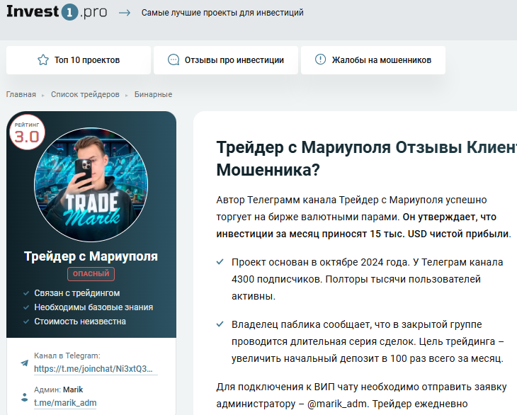 Но в сети есть жалобы на навязчивое предложение платных услуг. И на то, что реальная поддержка после оплаты оказывается ограниченной. В выдаче поиска Google есть сайт invest1, где канал «Трейдер с Мариуполя» имеет рейтинг 3.0.