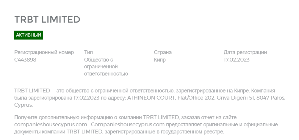 Проект представляет собой приложение в Телеграмм, где можно подключить оплату прямо в мессенджере, что позволяет подписчикам не ходить по разным ресурсам, а все делать в одном месте. Компания официально зарегистрирована как Trbt Limited на Кипре в 2023 году, что подтверждают данные с аналитических сервисов.