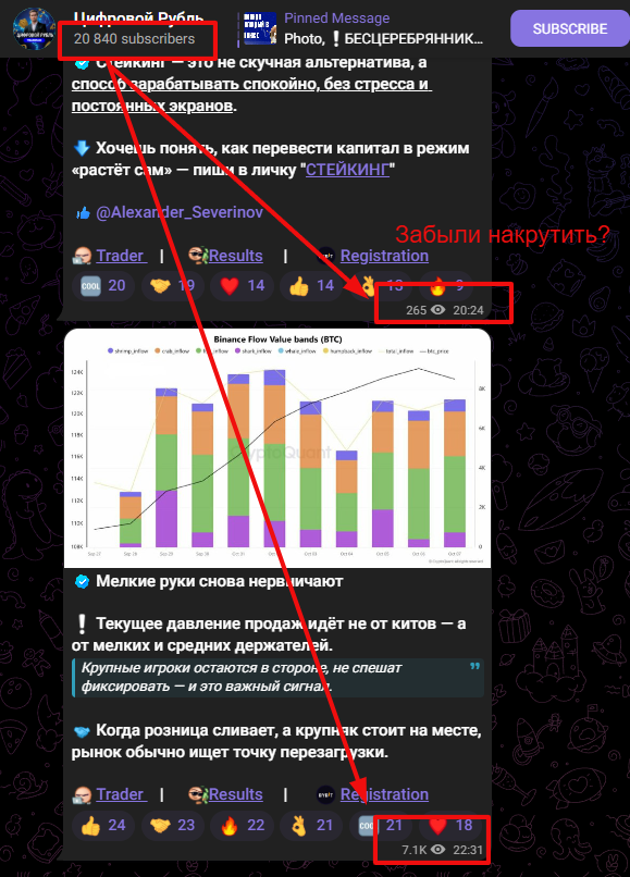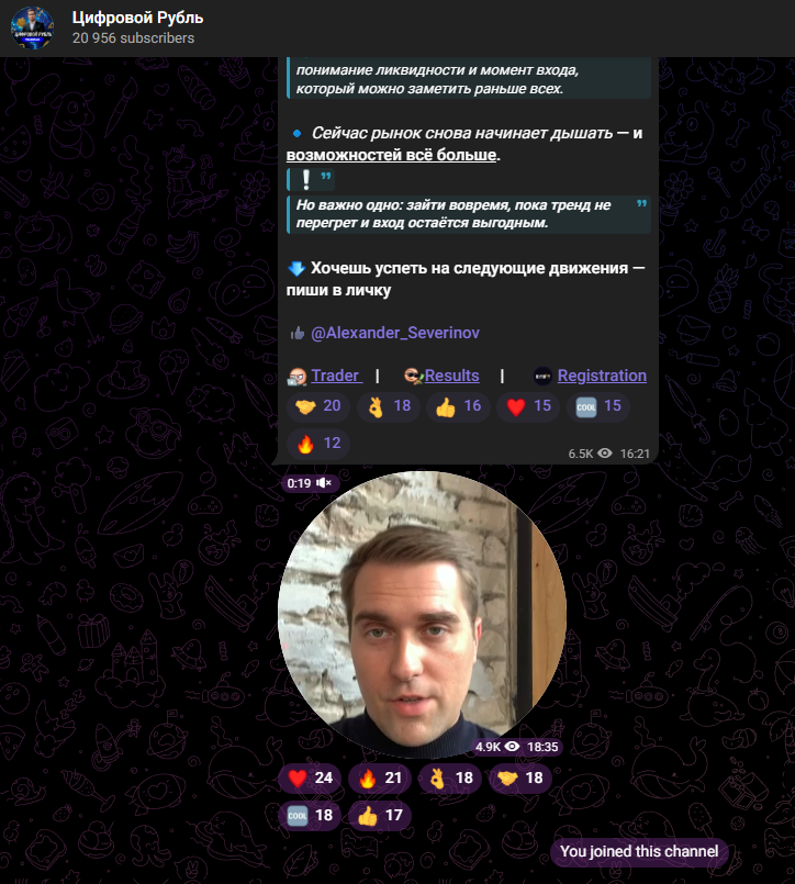 Телеграмм канал Цифровой Рубль создан в конце июня 2025 года, за три месяца трейдер накрутил аудиторию свыше 20 тысяч. В основном это боты, что видно по просмотрам тех постов, где автор забыл применить накрутку: 250-300 глазиков вместо стандратных 7-8 тысяч. Комментирование отключено, можно ставить только положительные реакции. Лицо канала — актер Владимир Андриянов, который по каким-то причинам представляется Александром Севериновым. В записанных кружочках никакой конкретики нет, термины употребляются с ошибками, которые реальный трейдер не допустил бы. Можно предположить, что ролики записаны на заказ, а к трейдингу Александр, он же Владимир, отношения не имеет.