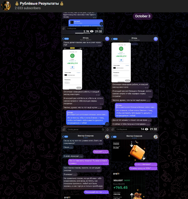 Отдельный канал с отзывами называется Рублевые результаты, на него подписано более 2000 человек, из которых большая часть — боты. Здесь можно посмотреть на результаты подписчиков, также в ryblevierezyltati есть скриншоты денежных выплат, которые предполагают, что деньги клиенты передают в доверительное управление Александру.
