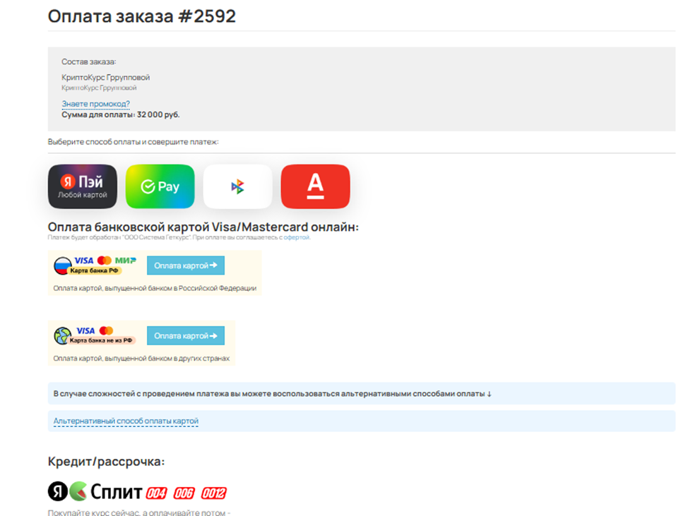 Оплату принимают через интерфейс площадки GetCourse с банковских карт, по СБП или в рассрочку. Судя по счетчику, на 01 декабря 2025 года курс купили более 2 тыс. человек.