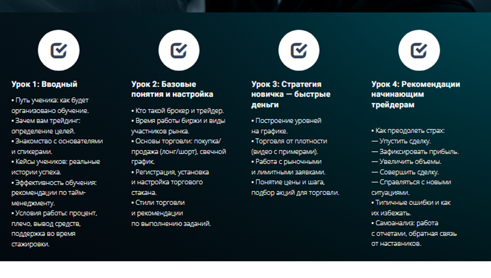 «Стажировка от Trade System» — бесплатная 30-дневная программа обучения, позволяющая быстро пройти этап от освоения базовых стратегий до практической торговли. Создатели курса утверждают, что 4 модуля полностью адаптированы к потребностям и целям будущего проп-трейдера, независимо от его стартового уровня знаний.