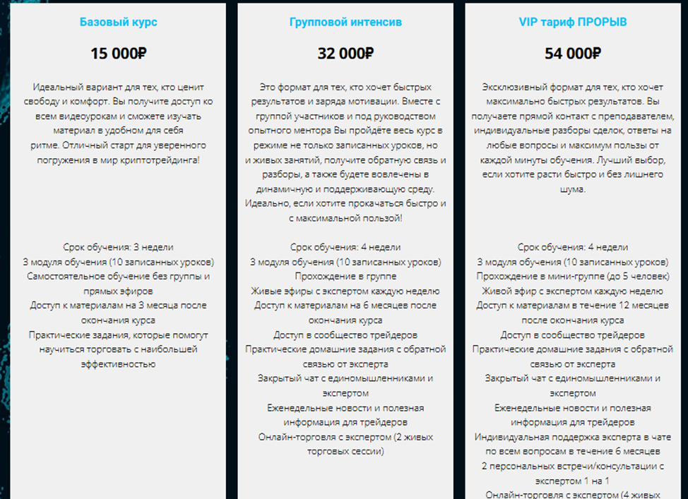 - «VIP-тариф Прорыв» за 54 тыс. рублей — эксклюзивное обучение в мини-группах с индивидуальными консультациями и торговыми сессиями вместе с ведущими трейдерами.