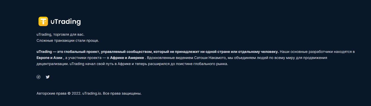 На странице проекта Utrading ai сказано, что платформа не принадлежит конкретному человеку / команде, а разработчики являются жителями абсолютно разных стран, что сделано для децентрализации, однако в таком случае принято делать исходный код программы публичным, чтобы участники сообщества могли корректировать его под себя или вносить изменения. Однако здесь фактически идет централизация вокруг телеграм бота, а команда вероятно просто врет, чтобы вызвать доверие у клиентов.