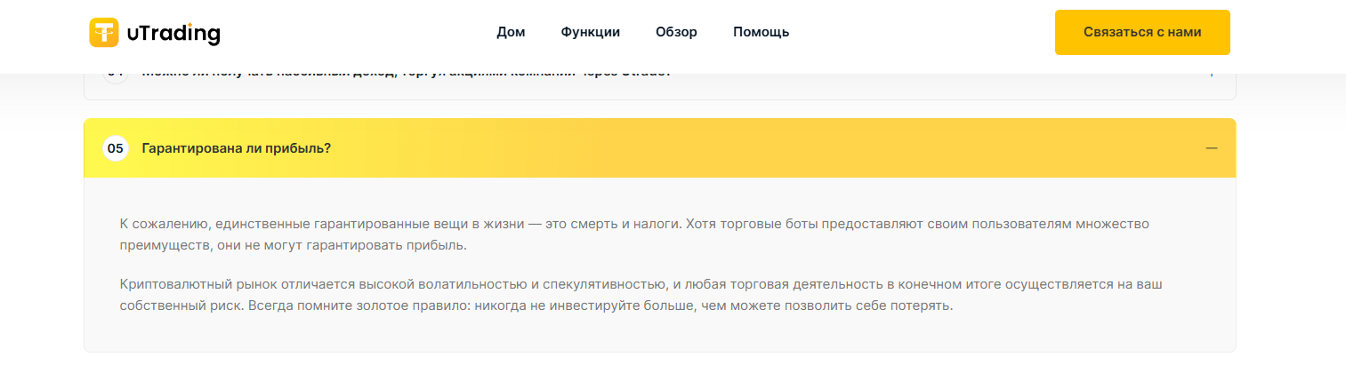От каких-либо гарантий заработка команда Utrading отказывается, даже несмотря на громкие заявления о высокой прибыли, что выглядит странно. Что касается плюсов, то через API ключ бота действительно можно подключить к любой бирже, которая поддерживает этот способ соединения, а сама автоматизация может стать полезным инструментов для опытных трейдеров, однако новички лишь рискуют потерять депозит из-за безграмотных действий.