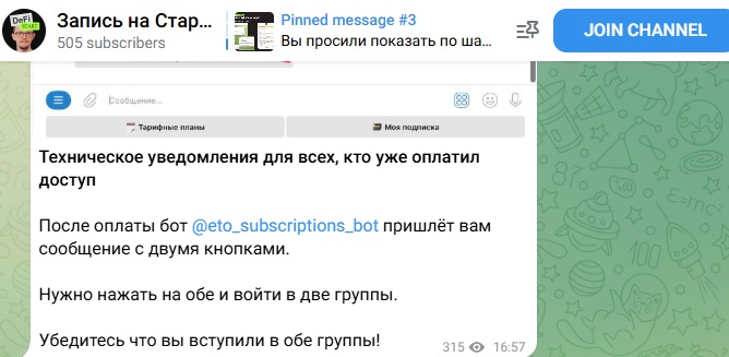 Также у проекта есть и другой тг-канал, который называется «Запись на Старт в DeFi | Касаткин». Он нужен для того, чтобы оставлять заявки на участие в платном обучающем курсе по правильным инвестициям. Каких-либо подробностей из обучающей программы или конкретных цифр по стоимости курса не предоставлено.