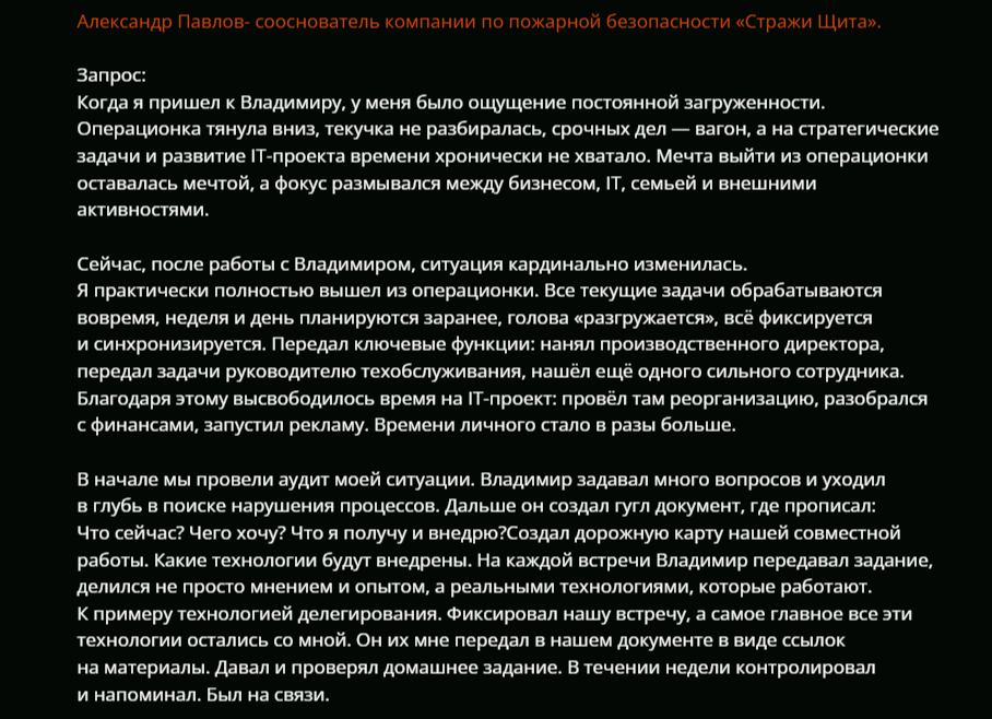 За долгое время своей работы в качестве бизнес-консультанта Владимир получил небольшое число положительных комментариев и благодарных роликов от довольных клиентов. Размещены позитивные отзывы на ресурсах, принадлежащих автору канала «Владимир Воронович Рост». По этой причине они не вызывают доверия.