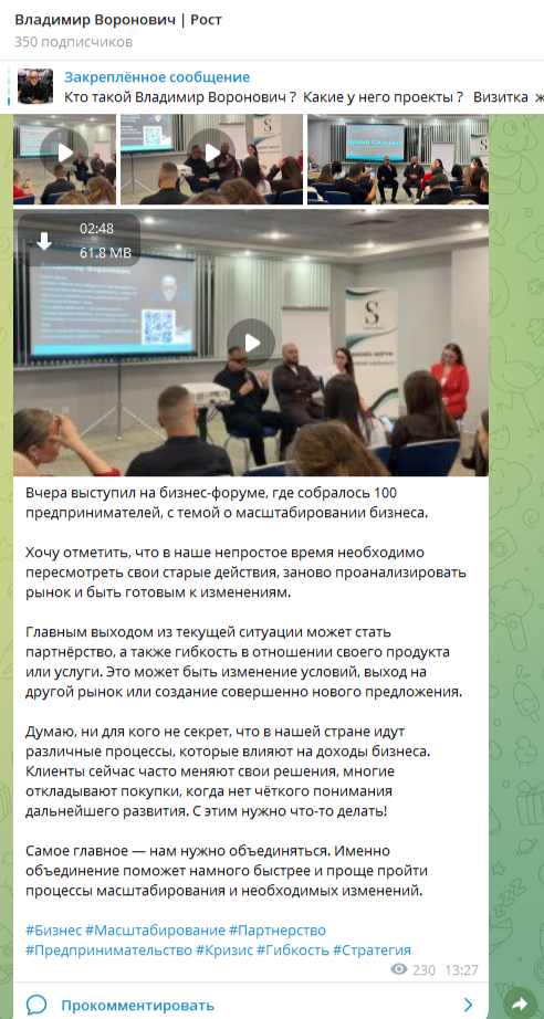Телеграм-канал бизнес-консультанта посвящен развитию себя и бизнеса. В рамках данного проекта автор не учит подписчиков совершать сделки с узкими спредами, торговать прибыльными активами. Эксперт из Голицыно Владимир Воронович на канале «Владимир Воронович Рост» продвигает определенные услуги: бизнес‑завтраки, мастермайнды, стратегические сессии. Основной контент проекта составляют: