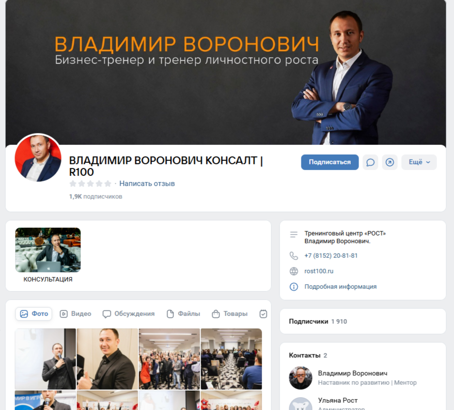 Бизнес-тренер Владимир продвигает свои услуги на большом числе различных ресурсов. Один из старейших его проектов «ВЛАДИМИР ВОРОНОВИЧ КОНСАЛТ R100» представлен в ВК. Группа была основана 21 августа 2009 года. Сообщество имеет 1 900+ подписчиков. В ленте представлены анонсы бизнес-конференций и реклама индивидуального обучения.