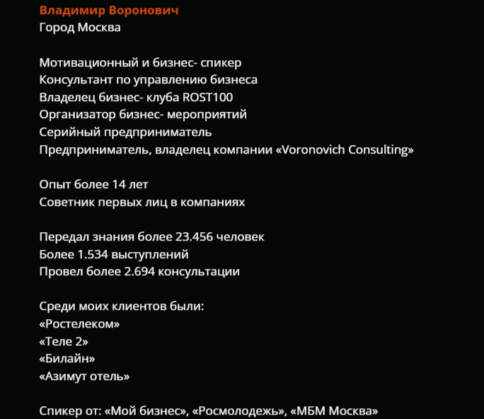 Наша команда сегодня не рекомендует читателям владельца канала «Владимир Воронович Рост» и других проектов. Хотите изучить азы прибыльного бизнеса – выбирайте более опытных экспертов, которые не обещают золотые горы, а планомерно ведут к победе. Об известных бизнес-тренерах мы рассказали в многочисленных обзорах.