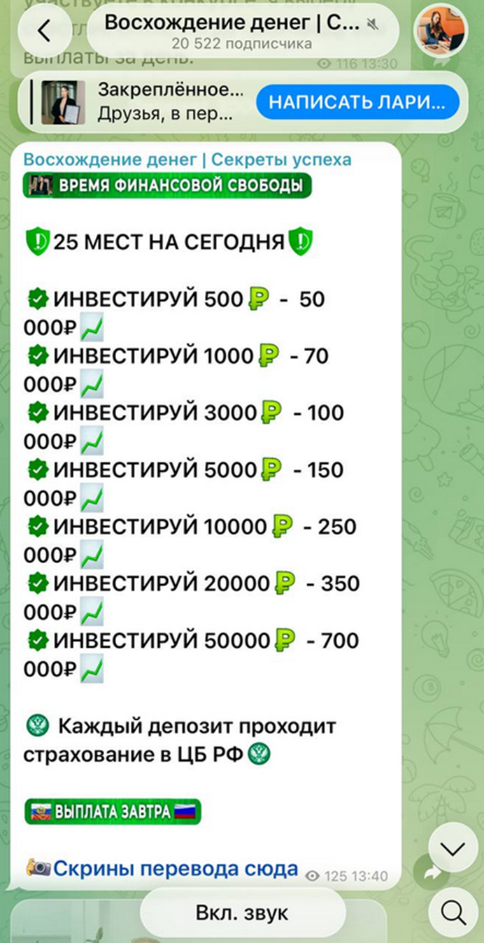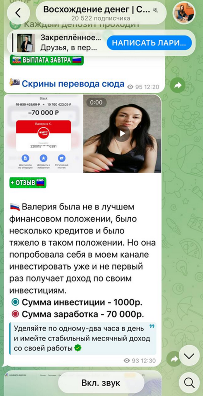 О самой Наталье ничего не известно. На самом канале она периодически называется Ларисой, что уже вызывает сомнения в работе этого проекта. Основная услуга одна – инвестирование от 500 рублей в крипту с получением 50 тысяч рублей дохода уже через 2-5 часов. За свою работу девушка хочет 30% от заработка. Своих подписчиков Наталья приглашает на сессии, уверяя в ограниченности количества мест.