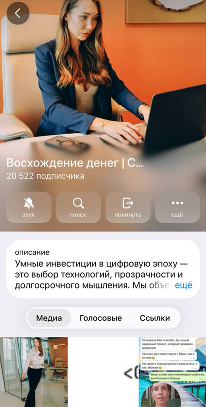 Телеграмм канал Восхождение денег | Секреты Успеха – приватный проект, автором которого указана Natali Crypt. В описании она говорит об умных инвестициях и цифровых технологиях. Но в реальности предлагает сомнительные услуги по раскрутке счета.