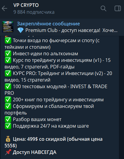 Telegram-канал VP Crypto отзывы получает чаще с позитивной реакцией. Его владелец утверждает, что торгует криптовалютой, много зарабатывает на трейдинге. Он предлагает подписчикам платный доступ в закрытое сообщество с сигналами и обучение торговле.