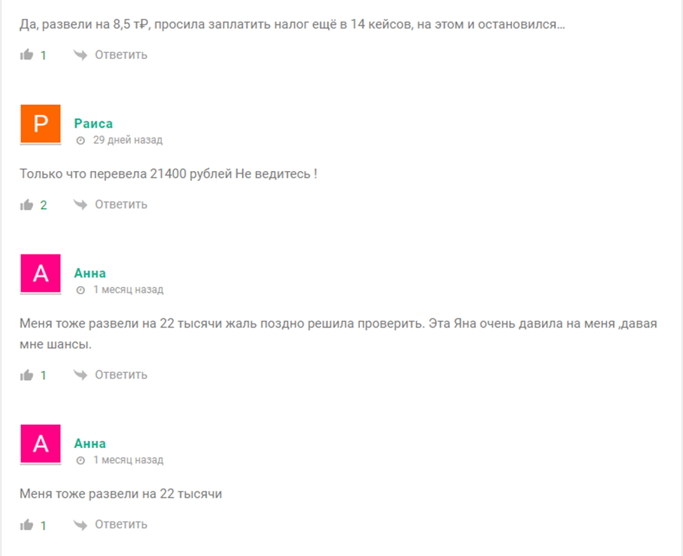 Пономарева Яна Олеговна заслужила только негативные отзывы. Сначала пользователя призывают перевести небольшую сумму, которая считается доверительным платежом. Потом якобы нужно оплатить налог, комиссию банка и иные расходы. Пользователи отмечают, что, если отказаться от всего этого, Яна ведет себя неадекватно, шлет оскорбления и угрозы. Поэтому этот телеграм-аккаунт считается скамом. Положительную обратную связь от пользователей мы не обнаружили.
