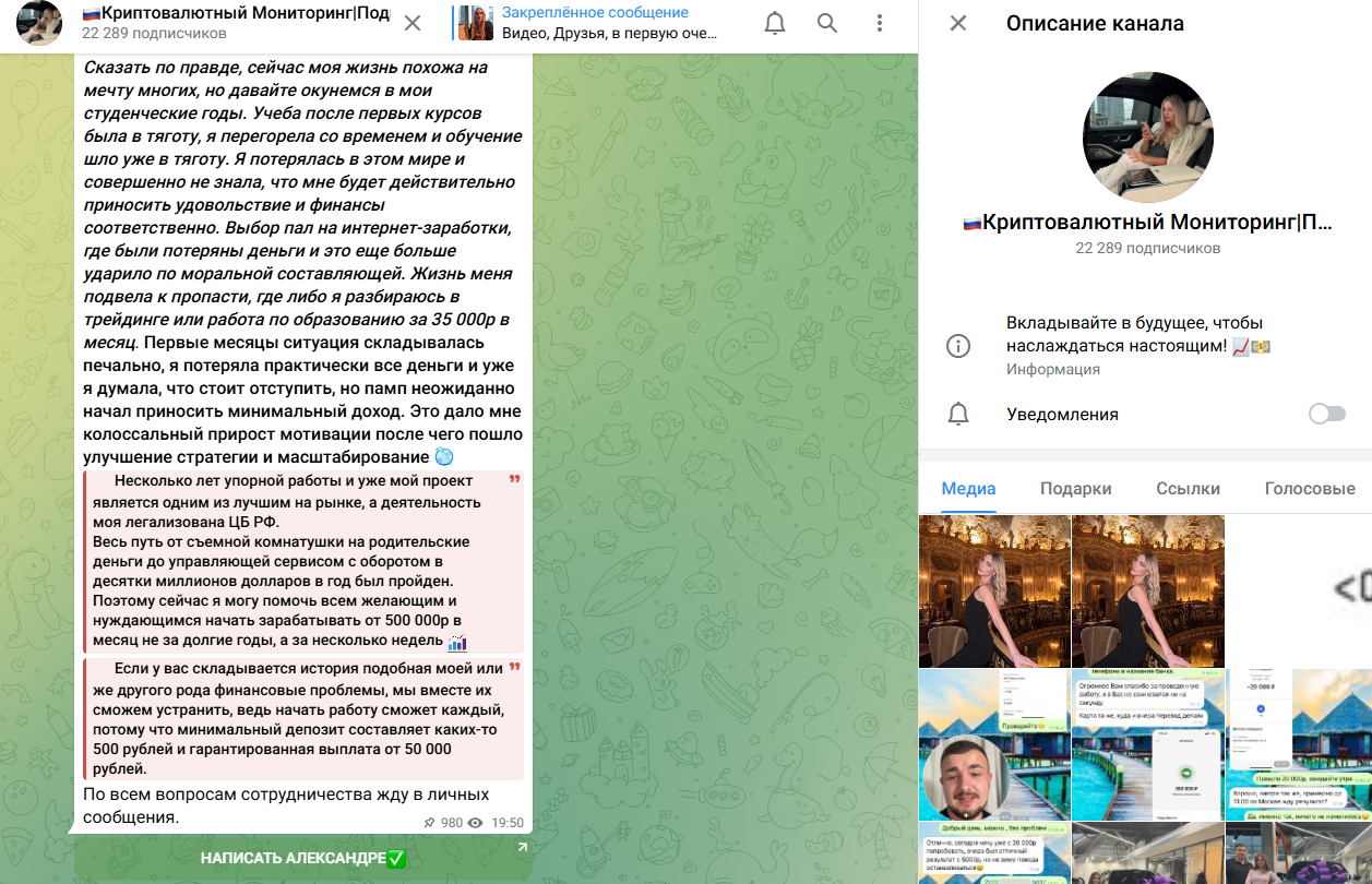 Как и большинство инфоцыган, в канале есть история о “сложной судьбе” инвесторши, где она работала параллельно учебе, ловила выгорания и сливала деньги на различных интернет схемах. Однако в моменте узнала про пампинг криптовалют, начала получать минимальный заработок. Это якобы замотивировало Александру и она смогла “улучшить” свою стратегию до идеала и передать ее клиентам, однако все это не больше, чем пустой звук. Многие аферисты часто пытаются привлечь наивных клиентов громкими и трогательными историями о взлетах и падениях.