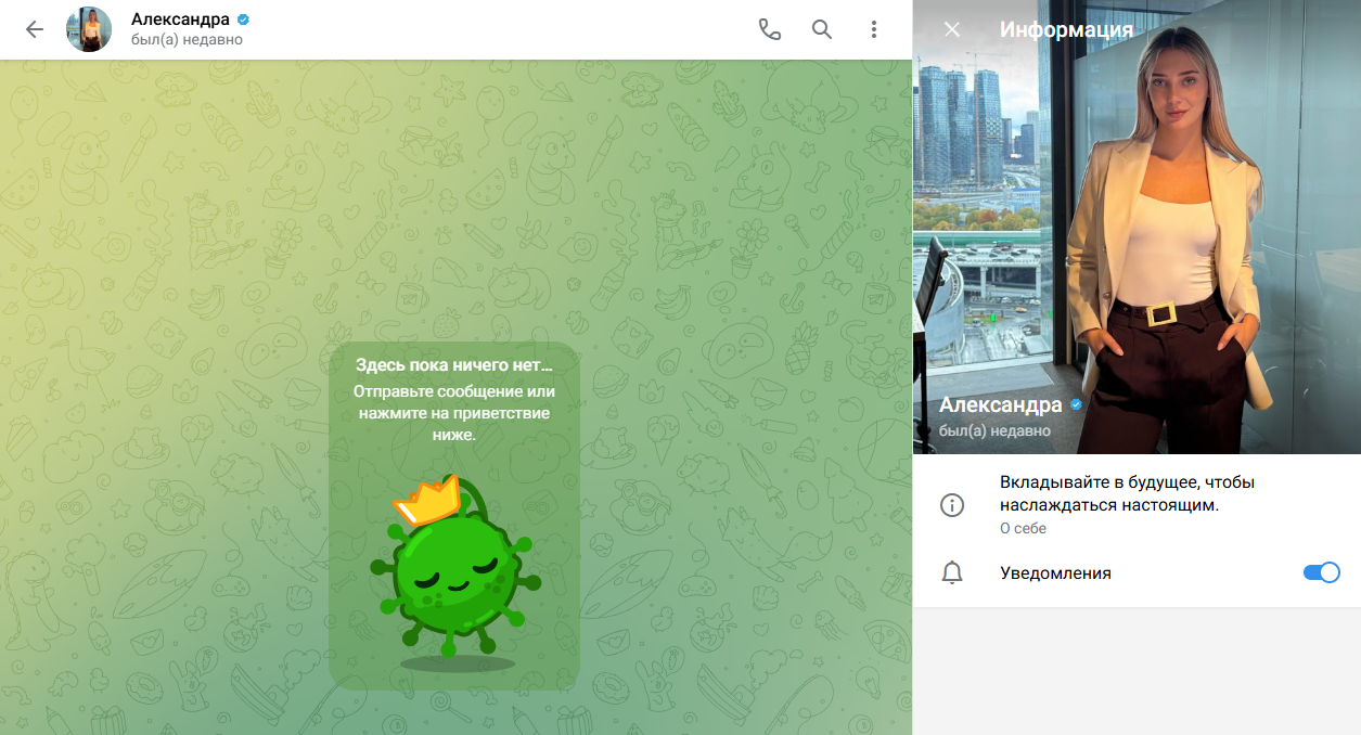 На первый взгляд телеграм канал был создан давно, в 2021 году, однако весь прошлый контент был удален, а сам проект видимо продан Александре, которая лишь в конце ноября 2025 года выложила первые посты. Если обратить внимание на статистику тгк, то число подписчиков превышает 22 000 человек, однако даже закрепленные посты собирают до 5% от аудитории. Это говорит о накрутке ботов и реально низкой популярности ресурса.