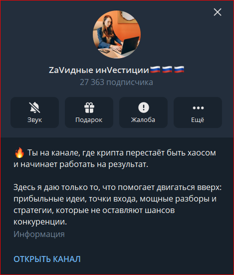 Zav идные ин V естиции» — телеграм-канал трейдера по имени Лариса. Девушка рассказывает о большом опыте в работе с криптовалютами. Пользователей она заверяет, что уже давно разбогатела благодаря ее уникальной стратегии, а теперь она готова дать такой же уникальный шанс заработать и своим подписчикам. Что конкретно предлагает девушка-инвестор, и можно ли доверять ее стратегиям, рассмотрим в статье.