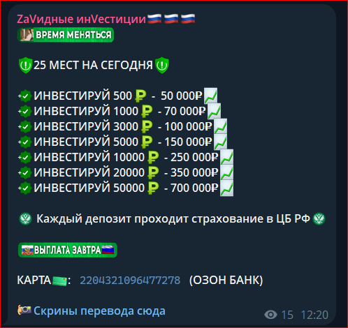Обзор телеграм-канала «Zav идные ин V естиции» показал, что проект принадлежит мошенникам. Скамеры используют распространенную схему раскрутки депозита. Они предлагают нереально большую прибыль всего за сутки. Самое главное, что пользователям для этого совершенно ничего не нужно делать, только отправить свои деньги. Стоит понимать, что даже трейдинг такой большой заработок никогда не даст. Также стоит обращать внимание на авторов таких каналов. Как правило, они не показывают себя и не дают никакой информации. Также в мошеннических каналах вы не найдете реального подтверждения компетенции и профессионализма трейдера. Чтобы не стать жертвой очередных мошенников, следите за нашими обзорами, мы раскрываем преступные схемы.