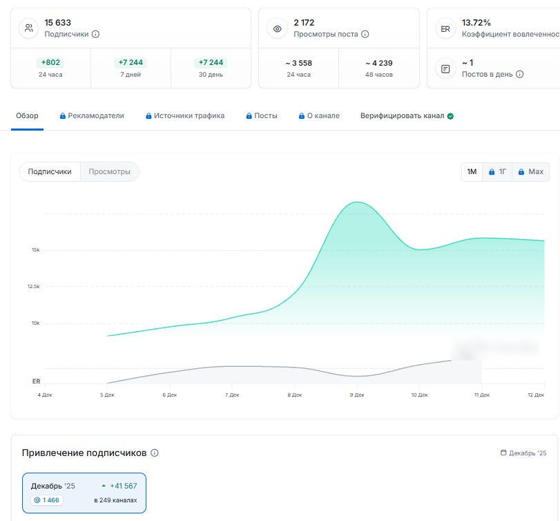 Например, только в декабре на телеграм-канал «Зеркало Тренда» подписалось больше 41 000 человек, часть из которых уже «исчезла» – динамика очень нестабильная, а вовлеченность на низком уровне.