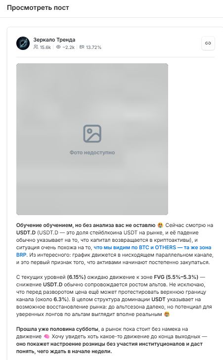 В рамках ресурса много контента, автор регулярно проводит разборы рыночных монет, говорит о тех или иных перспективах – такие материалы могли бы быть полезными, но в реальности не позволяют покупать или продавать активы. Анализ поверхностный, автор телеграм-канал «Зеркало Тренда» предпочитает не демонстрировать открыто свои методы или системы, так как проект рассчитан на платное сотрудничество.Не исключено, что посты копируют сразу в несколько сообществ, так как это популярная практика среди трейдеров, которые скрывают личность. Нет никаких подтверждений, что автор действительно умеет зарабатывать деньги – отсутствуют ссылки на верификатор или сторонние инвестиционные площадки.